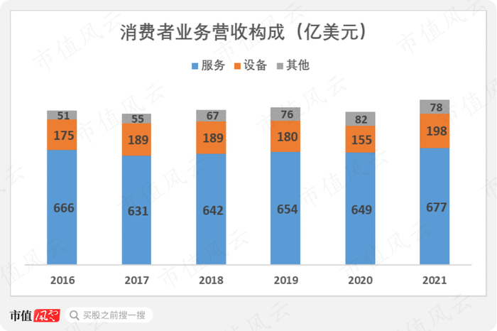 订阅服务自2016年以来几乎停滞了,收入从2016年的666亿美元增加到2021年的677亿元。