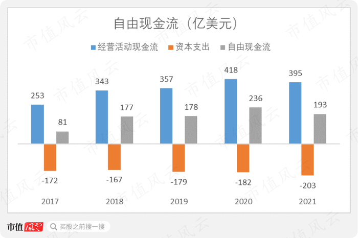 另外,公司的现金流情况十分健康,完全能覆盖每年都有的百余亿美元资本支出。