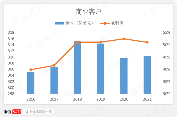 商业业务同样停滞了,收入一直维持在305亿美元至315亿美元之间,总体毛利率也维持在较高水平。