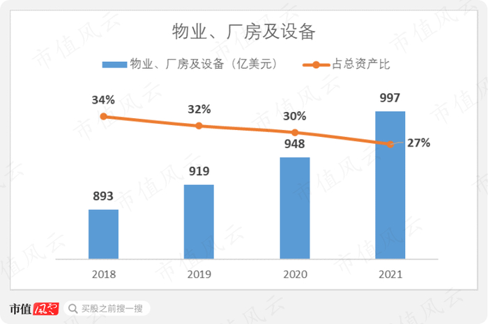 公司的物业、厂房及设备是公司能否提供高质量服务的关键所在,在2021年达到了997亿美元。其占总资产比虽然在缓慢下降,但丝毫不减其重要性。