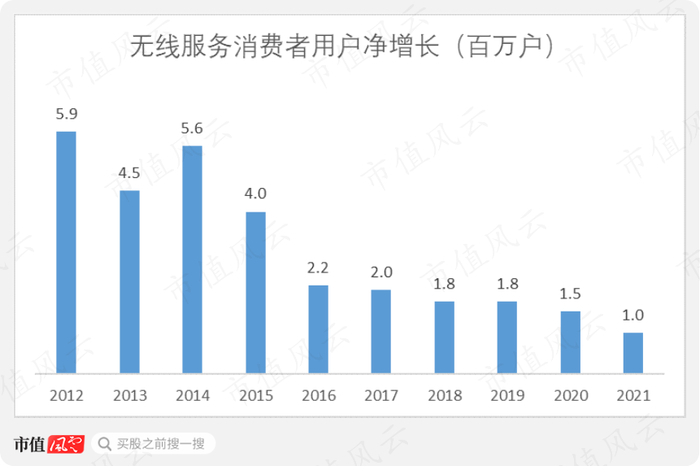 公司在2021年的用户仅增长100万户,而同期T-mobile增长了600万户。