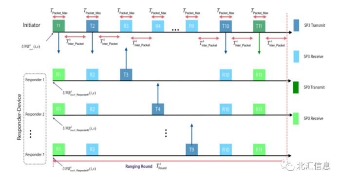 首先,Initiator(设备)发送一个Pre poll帧(SP0)到车上的每个Responder(车端的节点),Initiator再发送一个Poll帧(SP3)到车上的每个Responder,然后车上的每个Responder分别发送一个RSP帧到Initiator,Initiator再发送一个Final帧到车上的每个Responder,最后Initiator发送一个Final data帧到车上的每个Responder,这时一个测距会话就完成了,最终车端通过不同的节点和设备之间的距离算出与设备之间的距离。