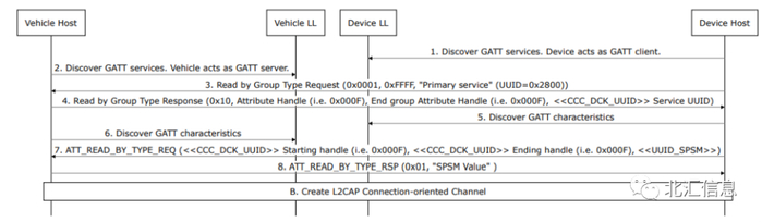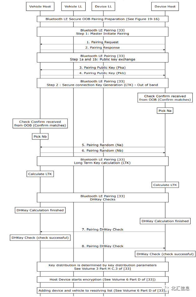 2) 公钥交换:设备向车辆发送BLE配对公钥。车辆向设备发送BLE配对公钥。设备和车辆生成DHKey;