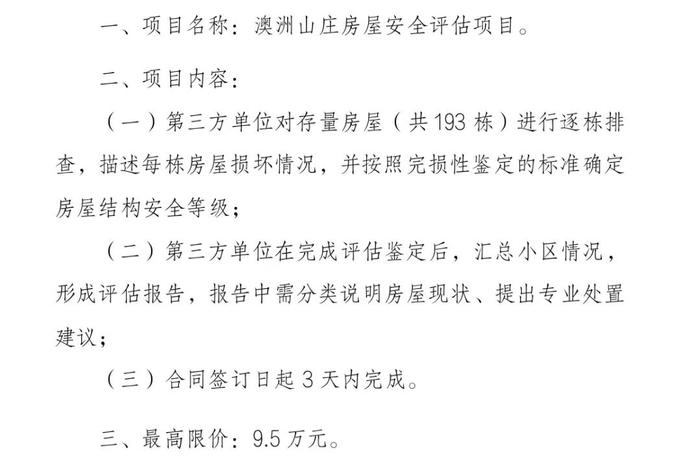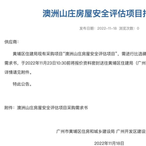 11月18日,黄埔区住房和城乡建设局(开发区建设和交通局)发布了一则澳洲山庄房屋安全评估项目招标公告。