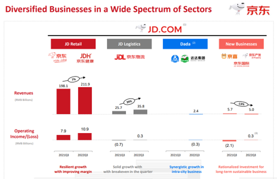 财报中,一直被视作短板的新业务(京东产发、京喜、海外业务、技术创新等)也在第三季度扭亏为盈,从上季度的单季亏损20亿元,转为实现了近2.8亿元的净利润。不过,新业务扭亏并非全部来源于业务形势转好,而是京东物业资产的出售和京喜拼拼的大面积撤店和京东国际旗下平台JOYBUY关停等措施减少亏损规模。