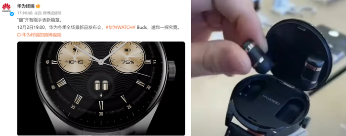 11月30日,华为官方宣布将在华为冬季全场景新品发布会(原定于12月2日,现宣布推迟)上发布新品WATCH Buds。结合此前网络爆料,这款新品应当为可翻盖内置无线蓝牙耳机的翻盖手表。