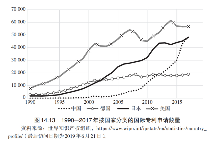 这并不是因为日本企业没有投资于研发,相反从国际专利申请数量标准看,日本在“失去的20年”里表现卓越,实际上仅次于美国,如下图所示: