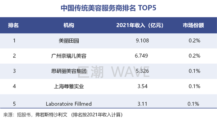 根据招股书,按2021年收益计,美丽田园在“传统美容”和“传统美容+轻医美”领域的市占率分别位居第一和第二,但在美容和非手术类医美领域的市占率数据却分别只有0.2%和0.6%,从中不难看出市场的高度分散状态。