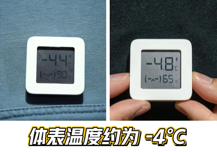 让两位测试人员,各放置两枚温度计进行对比。未做保暖措施前,贴身测量温度仅≈-4℃,体温流失非常快。