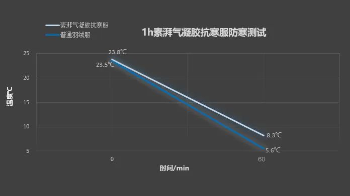 可以看到素湃气凝胶外套的保暖性优于羽绒服,降温速度更慢。