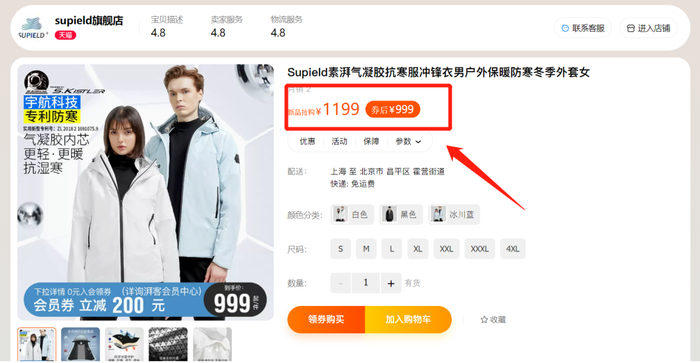 我们带来的这件“性价比逆天”的素湃气凝胶抗寒服旗舰店售价是1199元,活动价也得999元!