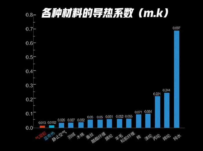 气凝胶的热导率,比鸭绒、鹅绒,甚至比空气都低,这是它保暖防寒的关键!