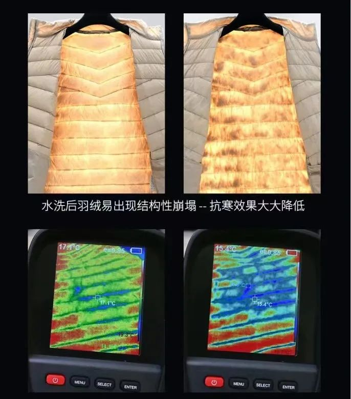 可以从测试中看到,羽绒受潮或水洗后,抗寒效果降低(温度变低约2℃)。