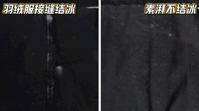 而且1小时后肉眼可见,羽绒服接缝处,已经被干冰冻出了冰霜,而抗寒服则没有。