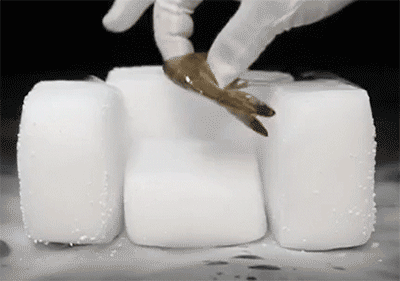 正常气压下,干冰温度通常为-78.5℃,如果没有足够防护,一只活虾很快会被冻成“冰柱”。