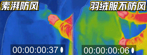 素湃品牌方也做了一项“保暖防寒”测试。实验结果也为气凝胶面料的保暖性,好于羽绒面料。