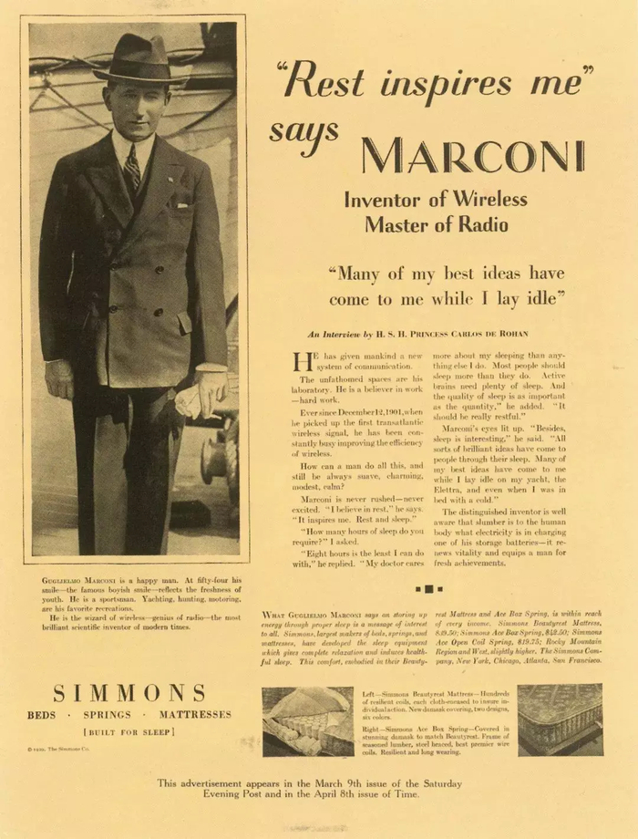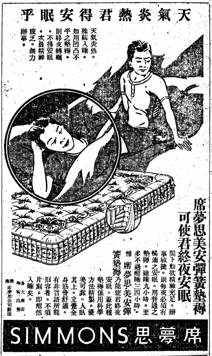 20世纪30年代,席梦思开始走进中国,在上海杨树浦路建工厂,并在当时火热的《申报》上刊登广告。中国人开始告别木板床,睡上了弹簧床垫。
