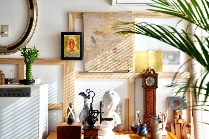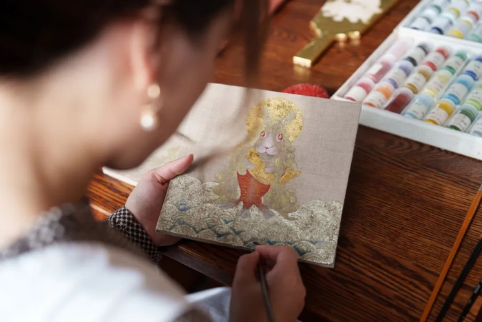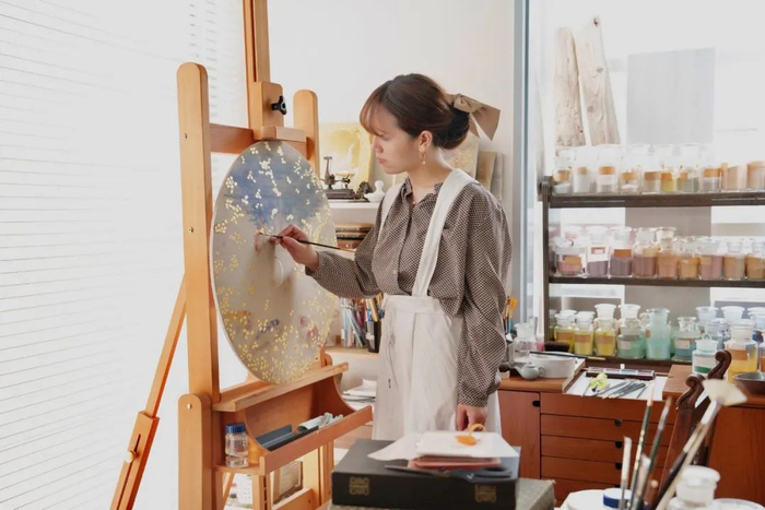 艺术家在金箔上用岩彩上色:在艺术家张媛媛的画中,我们能看到宋代文人花鸟画的恬静典雅、西方绘画中的立体空间感以及别具东瀛风情的图像元素,三者糅合中迸发出了与众不同的美感,诗情画意的美好图景跃然纸上。
