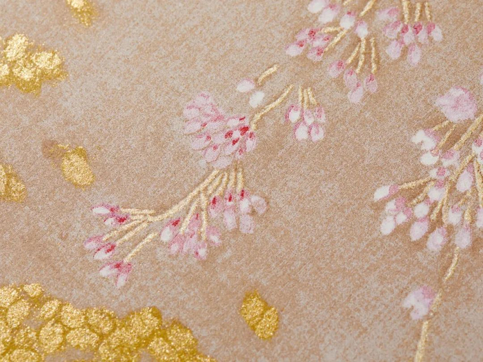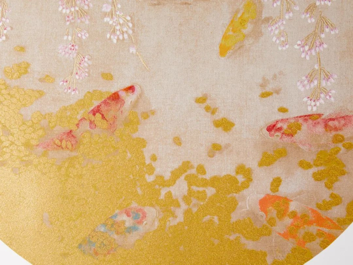 锦鲤细节:它们掩映在漂浮闪烁的点点金光之下,给人以灵动可爱的观感。画面中央是中式绘画里用以表现水面的留白,及一枝枝描绘细腻、粉中透白的垂樱,与倒映在水中的蓝色山峦形成色彩上的对比。