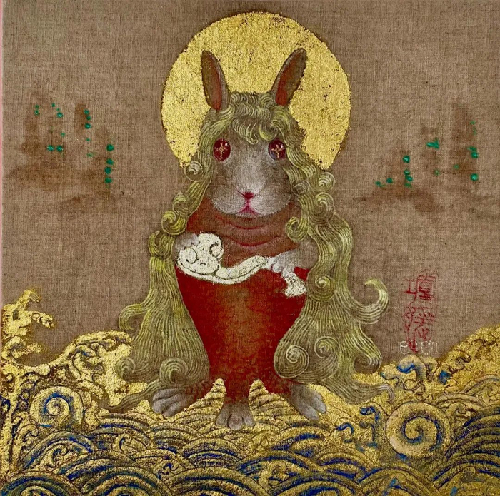 |张媛媛,兔年如意来迎图,2022;蜡画法、岩彩、金箔,20x20cm