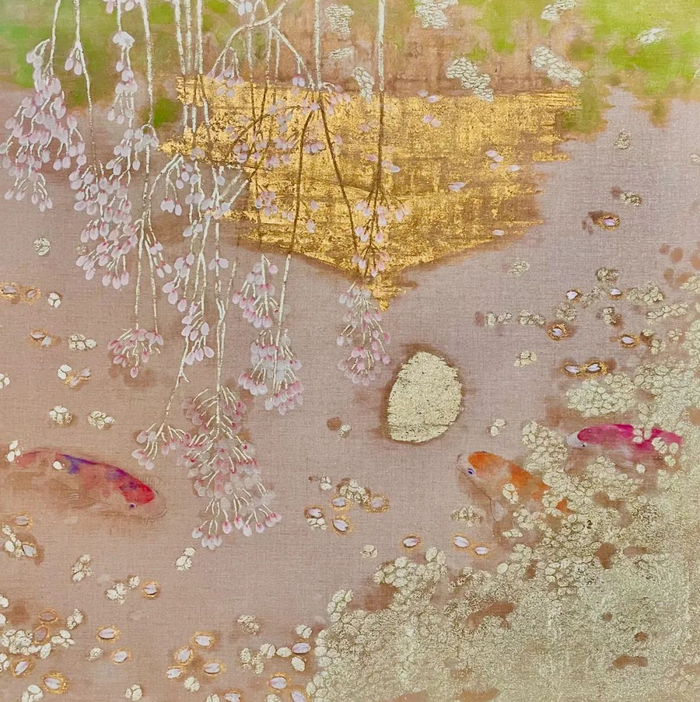 |张媛媛,水映寺游鲤图,2022;蜡画法、岩彩、金箔,53x53cm