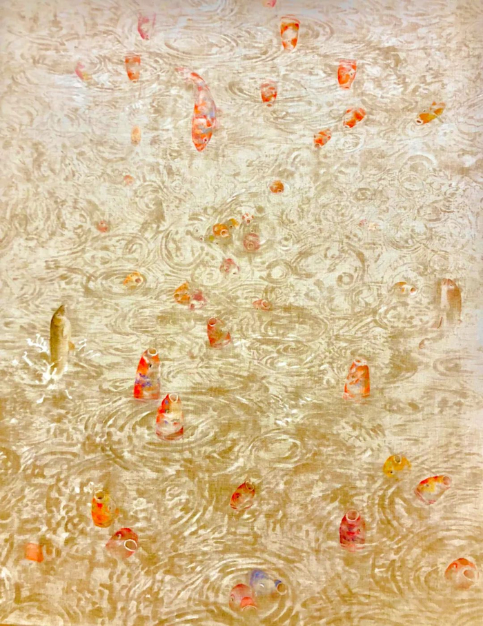 |张媛媛,鱼曼陀罗,2019;蜡画法、麻布、岩彩;上野之森美术馆绘画大奖作品。现藏于上野之森美术馆