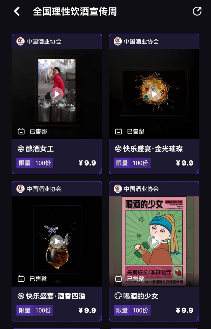 今年宣传周的创新尝试之一是发布理性饮酒公益主题数字藏品,将宣传周设计大赛和摄影大赛获奖作品中的一等奖作品,通过上链的方式形成数字藏品,同时把全国理性饮酒宣传周的LOGO标示进行动态化二次创作,制作成为3组数字藏品,共计10款数字藏品产品进行发售。理性饮酒公益主题数字藏品发布后,获得了广泛关注和热烈的反响,所有数字艺术品26日发售当天就已全部售罄。