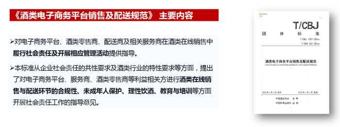 宣传周上正式发布的《酒类电子商务平台销售及配送规范》,从企业社会责任的共性要求及酒类行业的特性要求等方面,提出了对电子商务平台、服务商、酒类零售商等利益相关方进行酒类在线销售与配送环节的合规性、未成年人保护、理性饮酒、教育与培训等方面开展社会责任工作的指导意见,不仅有助于积极主动地提升行业在倡导理性饮酒方面的协作能力,强化行业自律能力,也将保护酒类行业以实现长期且稳定的发展。