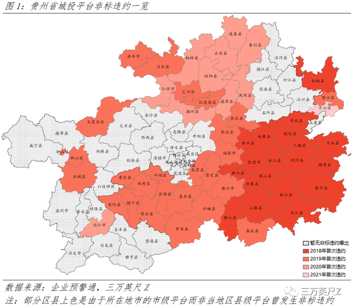 信托、资管计划、融资租赁等相对高成本的非标融资,此前是遵义城投平台重要的输血来源,尤其弱资质区县城投,而今违约问题已日益严重。据中诚信国际研究院研究员鲁璐统计,2021年城投非标违约风险持续释放,违约事件由上一年的28起增至31起,涉及城投企业由38家增至42家,违约金额超过40亿元;财政实力较弱、融资成本更高的贵州,是城投非标违约的“重灾区”,有29家城投企业非标违约,债务率高的遵义最多,有13家;黔南州、六盘水、安顺等地也不少。