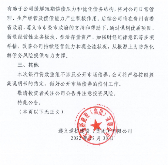 2022年12月30日,遵义道桥建设(集团)公告,公司按照市场化、法治化原则积极探索研究存量银行贷款重组工作,经与各银行类金融机构友好平等协商,基本明确相关重组安排,并在近期完成签署相关补充协议。银行贷款重组概况及进展情况:
