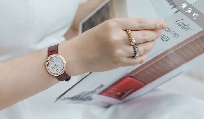 灵动的表盘让范主联想到“大珠小珠落玉盘”,在不同光线变换下,钻石像露珠一样折射出七彩光芒,充满韵律感。