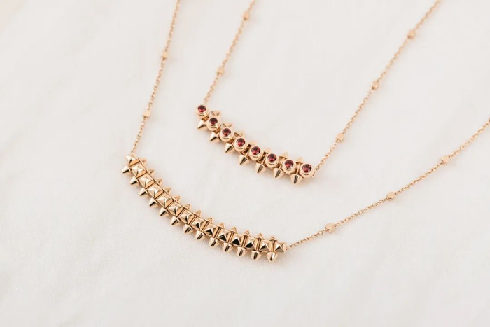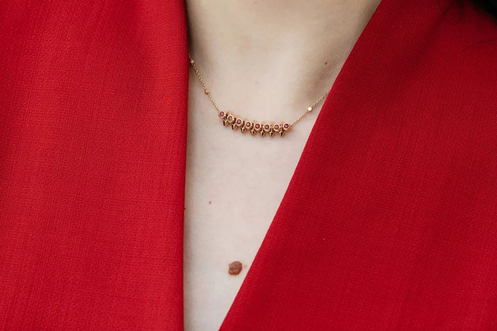 无论在日常生活还是职场当中,佩戴这款项链都很不错,简约而醒目的设计令人目不转睛。圆润饱满、光滑闪亮的红色石榴石和铆钉相映成趣,让懂珠宝的人能够一眼即识。有了它任何基本款衣服都能变得光彩熠熠,很适合追求独特的女精英。