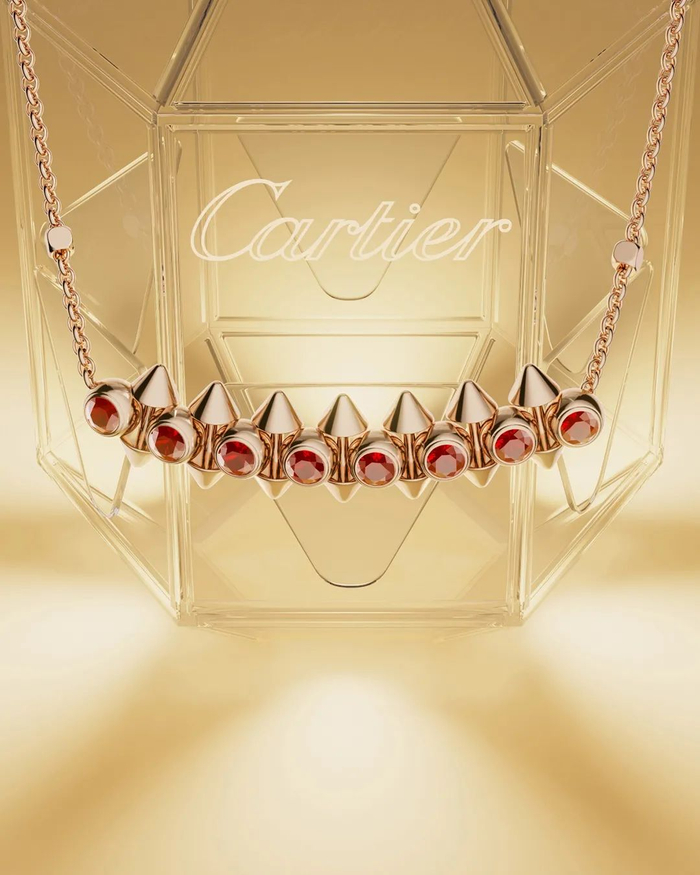 最吸睛之处在于8颗石榴石的加入,它们组成一抹浓郁的红,点缀在铆钉之间,像跳动的火焰,也像串联起美好记忆的红线。和之前的Clash de Cartier项链相比,新春限量款更显华丽热情、与众不同,分分钟起到画龙点睛的作用。