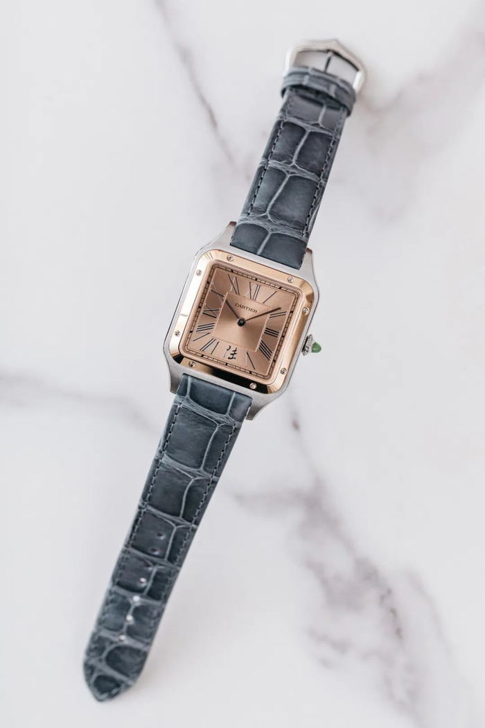 Santos标志性的精钢表壳,搭配玫瑰金表圈和缎面打磨玫瑰金表盘,洒脱中多了几分恰到好处的华丽。表冠镶嵌一颗绿色凸圆形软玉,又平添了中式意蕴,令人忍不住细品。