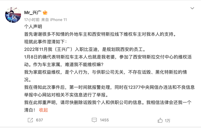 当事人王兴广@Mr_兴广 通过社交媒体发布声明说,2022年11月,他入职比亚迪,是规划院西安的员工。他老婆是特斯拉车主,他1月8日代表老婆参加了西安特斯拉交付中心的维权活动。