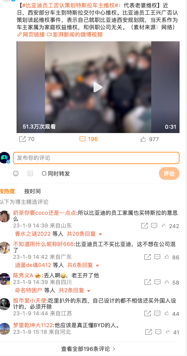 不久,有网友传出陕西西安维权的主角是比亚迪员工,并指称该员工策划了特斯拉车主维权活动。
