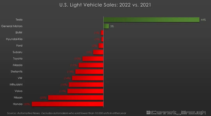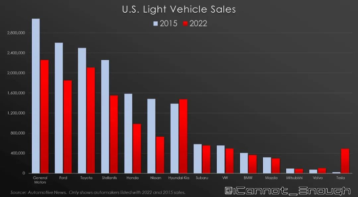 而当天其他美国网友转发相同的统计数据,图却不一样。不得不说,马斯克真会挑图。其实,马斯克不外乎想表达:“其他车企不行了,你看我一枝独秀。”