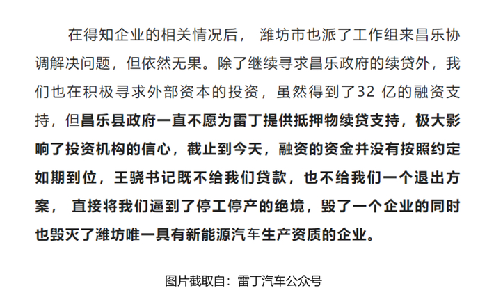 真正给予雷丁汽车致命一击的是,由潍坊国资领投的一笔32亿元融资款被卡了。这也就是李国欣在实名举报中所言的“王骁书记卡续贷,卡融资”,让雷丁汽车资金链断裂,工厂停产,陷入绝境。