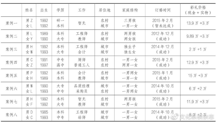 虽然后两句话有夸张成分,但可以看出,在家庭之外,还有一个更大的家族网络在发挥作用。最终,家族长辈参照婚姻市场中的标准价格并根据该女生的学历资本,提出了20万元的彩礼定价。