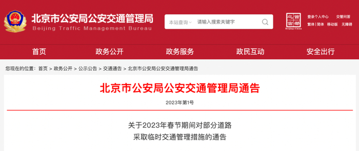 据北京市公安局公安交通管理局网站消息,2023年春节期间对部分道路采取临时交通管理措施。