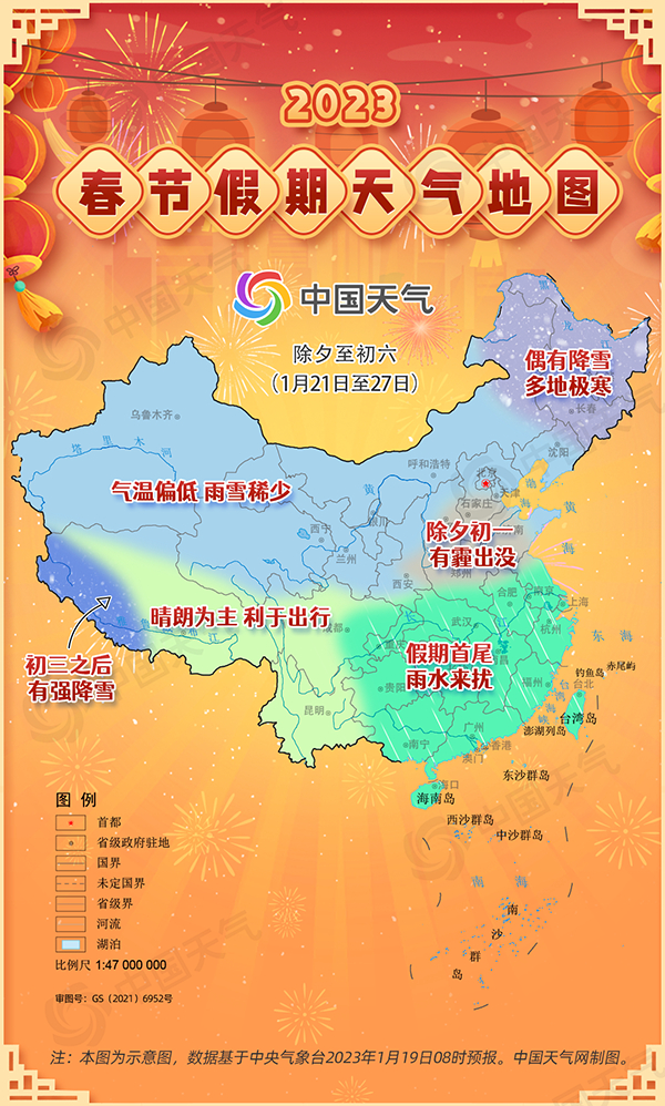 最后再来关注一下天气。中央气象台预计,春节假期,我国无大范围低温雨雪冰冻等灾害天气,中东部地区冷空气活动较为频繁;北方大部地区以晴到多云天气为主,平均气温较常年同期偏低1至3℃;南方地区有一次大范围小雨过程,平均气温较常年同期偏高1℃左右,需注意出行安全。