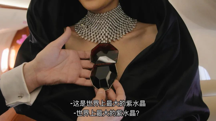 不得不说这设计师是懂贵妇心思的,除了华服的廓形要大,还要搭配一条专治“头tia和困不ki”的全世界最大紫水晶...