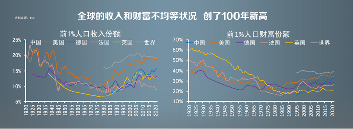 但是,到了上世纪80年代,全球出现了严重的“滞胀”现象,就是经济低迷但通胀非常高,经济学家认为主要是“凯恩斯主义”的措施用过头了,政府对经济干预过多、市场活力下降,加上超发货币,于是以芝加哥学派为代表的新自由主义思潮兴起,强调减少政府干预,鼓励资本自由化,重视经济效率而不是分配公平。于是,从1980年到现在,在全球化、资本自由化、经济金融化、赤字货币化等推动下,全球经济高速增长,一片繁荣,但是与此同时,全球的收入分配状况却快速恶化,到2020年前后,全球收入分配不均等程度创百年新高,达到了1920年前后的水平。