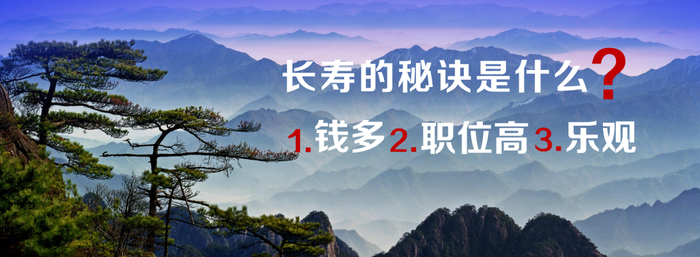 大家知道,活得长就是最大的胜利。首先,给大家做一个有趣的测试:大家觉得长寿的秘诀是什么?1、钱多,2、职位高,3、乐观。好,大家选一下。