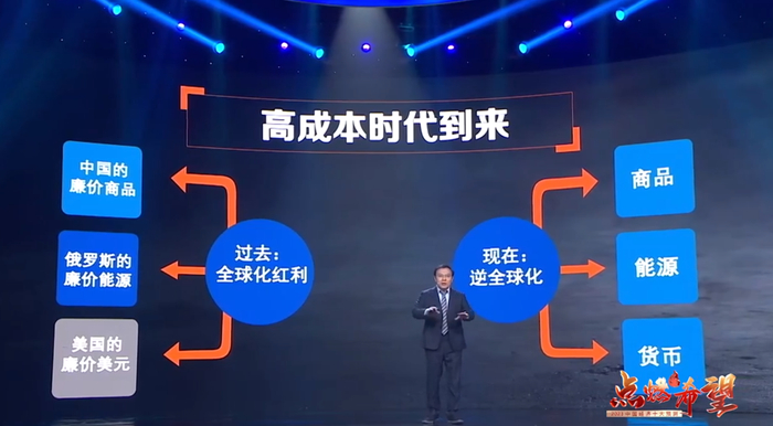 第三大预测:全球正迎来高成本的大通胀时代,能源、粮食、劳动力、资金、贸易、引进技术等的成本都在上升,世界经济从过去几十年的“高增长、低通胀、大缓和”黄金时代进入“低增长、高通胀、大动荡”黑铁时代,也可称为“后全球化时代”,这既带来重大挑战,也带来重大机遇