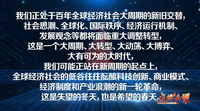 第二大预测:我们正处于百年全球经济社会大周期的新旧交替,社会思潮、全球化、国际秩序、经济运行机制、发展观念等都将面临重大调整转型,这是一个大周期、大转型、大动荡、大博弈、大有可为的大时代,我们可能正站在新周期的起点上,全球经济社会的低谷往往酝酿科技创新、商业模式、经济制度和产业浪潮的新一轮革命,这是失望的冬天,也是希望的春天