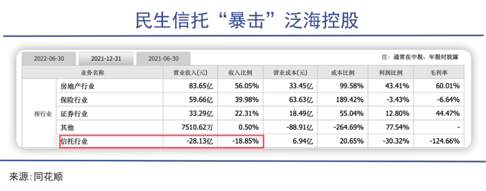 2021年,由于减值计提、延期兑付等因素影响,民生信托连营收都是负的,全年实现营业收入-28.13亿元,遑论盈利。