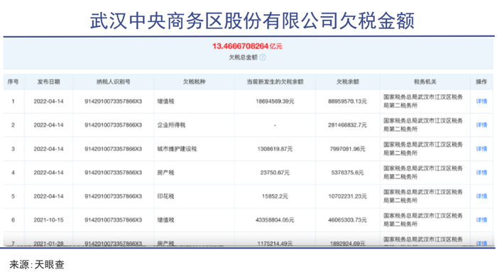 而原本应该作为纳税大户的武汉公司,如今已成为欠税大户,目前拖欠税款高达13亿元,被税务局挂网公示。此外,武汉CBD项目涉及的工程、装饰等供应商纠纷也超过百条。