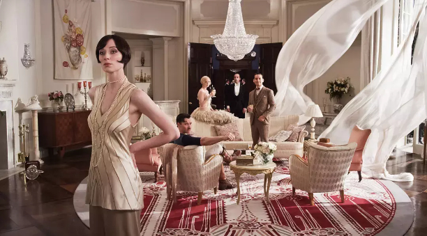 说到电影《了不起的盖茨比》,人人都会想到里面纸醉金迷的画面。精致妆容的性感妇人戴着镶满钻的头饰,身着昂贵的亮片裙,在金碧辉煌的大厅里摇晃碰杯。