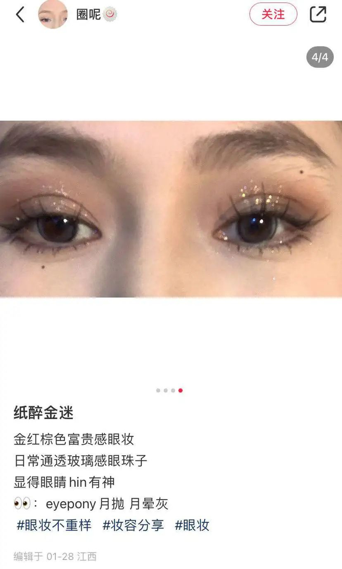 虽说这类风格养活了一大批高光商家,但更多的还是网友自发拍摄。随着“纸醉金迷风”的流行,还有不少博主巧用妆容教程趁机推荐产品,风也跟了,产品也发了。